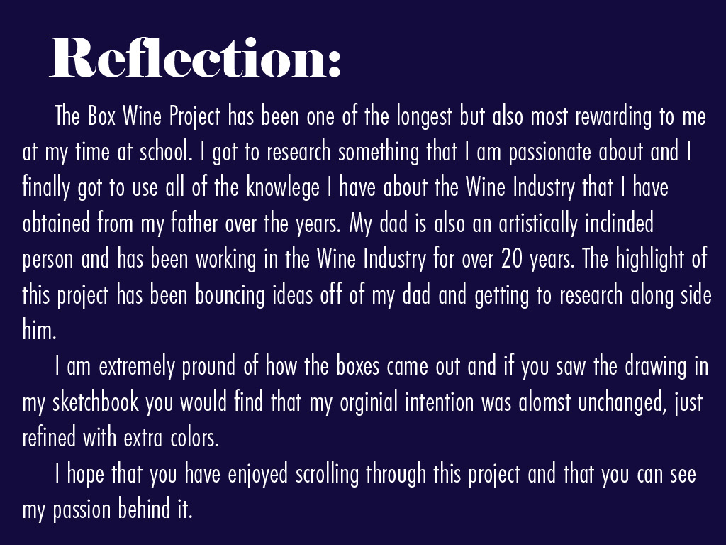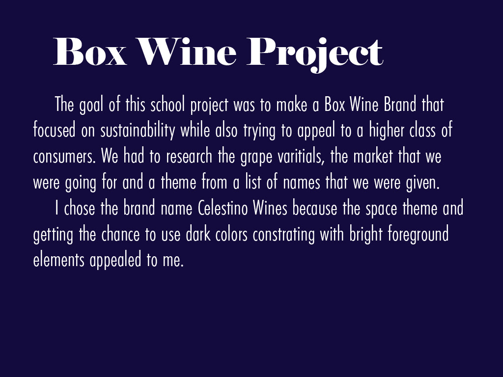 This was a project that I developed form my Graphic Production class were the goal was to research your intended target demographics and creat a visual identy for a wine brand that focused on sustainability.